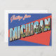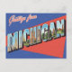 Det här vackra vykortet har ett klassiskt "Hälsning från Michigan" stort brev med en nostalgisk, återseende känsla. Varje brev i "MICHIGAN" fylls med en unik scen från den Underbara Sjöar-staten, där man visar upp ikoniska landmärken som den stora Mackinac-bron, den bedövande strandlinjen i Pictured Sten National Lakeshore och de enorma sovande björnarna Dunes. Paletten vintage färg och den strandade bakgrunden lägger till den gammaldags karmen, skapar den en perfekt eller en tankfull ton att skicka till vänner och familj. Perfekt för resenärer, vykortssamlare eller för alla som kärlek Michigans naturskönhet och pulserande själ.