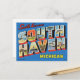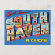 Detta är ett klassiskt vykort i vintage-stil med frasen "Hälsningar från South Haven, Michigan". De stora, stiliserade bokstäverna i SOUTH HAVEN innehåller var och en en unik scen eller landmärke från staden, inklusive dess fyr, stränder och båtar på vattnet. Designen har en nostalgisk, mitten av seklet-känsla med sin retrofärgskala och feta typsnitt, vilket gör den perfekt för produkter som vykort, affischer och t-shirts för alla som älskar vintage-reskonst eller den vackra regionen South Haven.