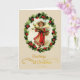 Denna ursnygga anpassadehelgdagdesign presenterar ett beige kort med guld- typografi, som läser "hälsningar på jul", och en gullig Victorianflicka, ett iklätt rött och en vit som går till och med en snöig äng.