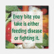 "Varje bita du tar matar sjukdomen eller bekämpar den" citat eller inspirerande ordspråk som påminner oss om en hälsosam kost. Bakgrunden är ett foto av färglösa färska grönsaker.