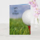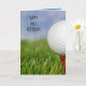 Stäng av vit golf boll på rött gräs till lycklig halv födelsedag. Ålder på golf boll kan redigeras.