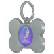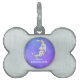 Denna benformade husdjursidentifikationsmärket har en vit halvmåne med ett sött ansikte med blå ögon och rosa läppar med färgglada markeringar i blått, gult och lila på en lila himmel med prickiga stjärnor.. Anpassa namnet och ditt telefonnummer med mallen.