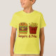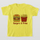 Digital tecknadbilder av en cheeseburger och en beställa av småfiskar med gulliga ansikten. Nedanfört är de formulera "hamburgare och småfiskar",