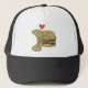 Gullig tecknad av en cheeseburger som kramar en grupp av småfiskar.