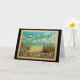 I Hälsning från Hamptons vycard-vintage finns en sandstrand med en vacker turkoshav över vatten och över havet, ett blå himmel med gigantiska vita moln. I vintage resor stil.