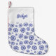 Snyggtens blå och vita mönstrade julstrumpor. Den blå Boho-blomman från Hampton Daisy skrivs ut på vit bakgrund. Lagringen har en roligt grafik som simuleras i päls-trim där du kan lägga till ditt eget namn.