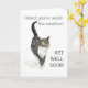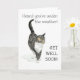 Ett "Get well card" med en grått tabby och vit katt från en vattenfärgsmålning av Judy Adamson. Texten på framsidan är: "Lyssna på vädret! HEJ, och insidan är lämnat tom för ditt eget meddelande.