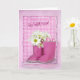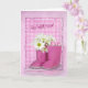 Daisy bouquet i rosa stövlar med rosa och vit gingham-bakgrund med sömnad i ram. För snart.