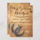 Det är perfekter för land westerna bröllop. Lägg bara till din egen formulering till mallen för bröllopsinbjudan. Baksidan har bröllop-datumet i ett rustiskt skript-typsnitt. landsbyggsbröllopets inbjudningar, inbjudningar till russinbröllop, hästskon, hästskon, inbjudningar till westerna bröllop i land, inbjudningar till cowboybröllop, bröllopsinbjudningar i lada, rustiskt trä, plågat trä.