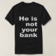 En minimalistisk grafisk design med en lekfull vrid på traditionell bankbild med frasen "han är inte din bank" i fet, modern typografi.