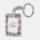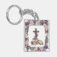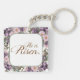 Den Påsk-temade nyckelringen har en rosa och lila vår blomkrans gräns längs kant på en ljusvit bakgrund. I mitten finns en kor med en bibel och en vår blommigt bukett med versen "Han är Risen".