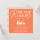 Skicka denna korallröda påskinbjudan till din familj och vänner för att låta dem veta att du kommer att vara värd för en påskfest. Designen är elegant enkel med orden "HAN ÄR UPPVÄCKT" högst upp, tillsammans med en charmig påskscen som innehåller siluetter av kaniner, fjärilar och en påskkorg. Alla dessa element är satta mot en korallfärgad bakgrund, medan resten av texten, inklusive evenemangets detaljer, är i vitt. Du kan anpassa informationen efter dina behov. Så, lägg din beställning idag!