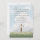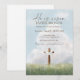 Denna kristna påskbrunch-inbjudan visar en fredlig himmelbakgrund med en korsillustration och budskapet ”Han är uppstånden.”