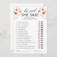 Gör dig redo att lägga till en touch av elegans till din sommar- eller vårbröllopsfest med vårt 'Han sa att hon sa' röda akvarellbröllopsduschspel. Detta anpassningsbara bröllopsdusch-spelkort har fantastiska akvarell handmålade röda blommor och elegant kalligrafi, vilket gör det till den perfekta tillägget till din fest.