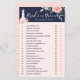 En elegant, snyggt och trendig blommigt ro-möhippa sa att hon sa möhippa-spel. Utformningen har vår handmålade chic, elegant och moderna, rena vita och blek rosa-klänning med en botanisk trädgård av blommande ro och blommigtar. Blommigtens klänning hänger på en ornerad vintage stil faux guld klänning. Mjuka detaljer om blomman snöre och mousserande påsar på bröllop-klänningen skapar ett vackert, sofistikerat och lyxigt utseende. Ett vackert skript med stil handskriftsformat "Bride or Groom" i vitt. Den marinblå, rosan och faux färg-paletten skapar ett utseende av trendig, shabby chic och vintage guld. Vattenfärgen blommigt ro ram överst. Den omvända sidan har en minimalistisk bakgrund för rosa av blek med ett guld hjärta mönster som på ett vackert sätt kompletterar den främre grafiken. Handritad originalgrafik med Moodthology.