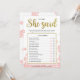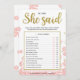 Detta moderna blom-"Han sa att hon sa" bröllopsfest-spel har en rosa blommig bakgrund med gyllene glitterstänk. Texten är skriven i en blandning av en lekfull kalligrafiskrift och ett modernt sans-serif-tecken, detta Han sa att hon sa-kort är personifierat med brudens namn och datum för bröllopsfesten.