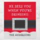 Han ser dig när du dricker rolig julhumor Tomte Vin Etikett. Anpassa denna anpassade design med din egen text och familjenamn.