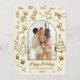Whimsical Gold Hand-Drawn Doodle Arch Photo Christmas Card. Send festive holiday wishes with this adorable hand-drawn scribble-style Christmas photo card. The front highlights playful faux gold Christmas motifs and ribbon bows arranged around an arch photo frame, finished with a joyful Happy Holiday script and your family name on a soft ivory or cream background.