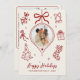 Whimsical Hand Drawn Christmas Motif 4 Photo Happy Holiday Christmas Card. Add a touch of festive charm to your holiday greetings with this adorable hand-drawn scribble Christmas photo card. The front features cute, playful red Christmas motifs arranged around a central ornament illustration with a coquette bow, framing your main family photo, along with a cheerful Happy Holiday script and your family name—all set against a soft ivory or cream off white background.