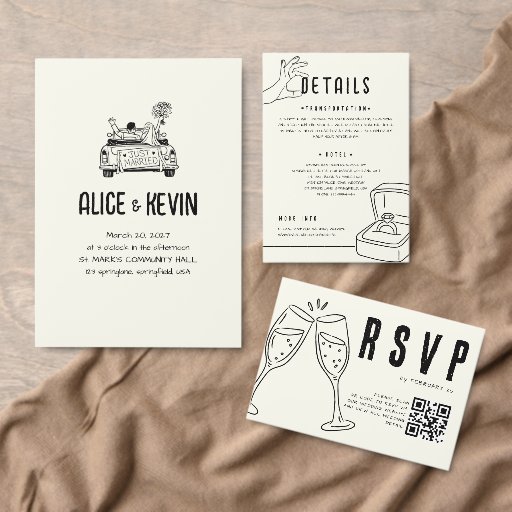 Hand Drawn Illustration Ivory Minimalist Wedding Inbjudningar