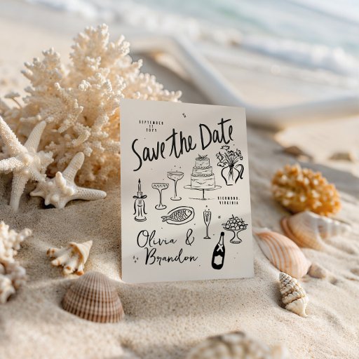 This elegant yet playful design showcases delicate black ink line illustrations — including cake, candles, wine, florals, and celebratory details — arranged in a soft, airy layout that feels personal, timeless, and joyful. Perfect for couples looking for a wedding invitation that is artistic, modern, and full of character without feeling overly formal.