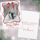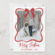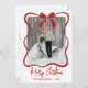 Send holiday cheer with this vertical Christmas card featuring a single centered photo framed by a simple swirling ribbon-style border. A hand-drawn coquette bow sits right at the top, with the ribbon and outline details all in red for a clean, festive look. Below the framed photo, “Merry Christmas” appears in red handwritten script, with space underneath to center your family name or individual names.