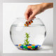 En grafik av hög kvalitet som visar en hand som försiktigt placerar en fisk i en klar fiskskål. Den rena vita bakgrunden och det rena linjer gör detta till en perfekt för en mängd olika hemvaror och kläder.
