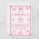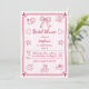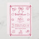 Hand plockade rosa och vit klok vimisk Fransk stil bröllop inbjudningskort för möhippan. En snabb och visuell inbjudan som innehåller handritade illustrationer av flera vinklade dockor, inklusive hjärtan, ring och en båge i magenta på ljus rosa och vit strimlad bakgrund. Det handskrivna teckensnittet och ram med hjärtan i hörnen ger en trevlig beröring som perfekt återspeglar glädjen och upprördheten hos möhippan firande.