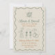 Den här bröllopsinbjudan kombinerar vintage charm med en modern tvist med ett disco boll, kaka, champagneglas med bovar och bröllop ringar i handritade illustrationer. Den mjuka grönten färg på en krämbakgrund, som gränsar till ett vågigt ram, tillför lite elegans och stollig.
