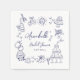 Personlig Hand- Drawn Quirky Möhippa Napkins. De här roligtarna och de lekfulla blöjorna med möhippa ger snabba doodleillustrationer som omger designen, allt i ett marint blått tema. Inslag som en champagne torn, bröllop tårta, disco boll, hjärtan, bröllop klockor, ringar, kameror, och mer skapar en vismisk och berömmande vibe. "[Brides Namn] Möhippa" och datumet visas elegant under teckningen i en blandning av handskript och typsnitt i marint blått, med en snyggt och personlig tryckning. Med det här anpassadet kan du justera text och layout så att de passar möhippans tema. Perfekt för cocktail-timmen, dessert bord, eller som en charmerande detalj vid ställe, ger dessa blöjor dig en lekfull charm och sofistikering till firande.