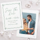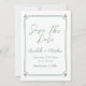 Enkelt handritat Whimsical Sage Grönt Bröllop spara datum. Denna EU-inspirerade grönt och vita Spara datumkortet har en ren, minimalistisk perfekt för par som vill ha en tidlös elegans. Ett subtilt handritat ram med charmerande grönt i varje hörn omger försiktigt dina uppgifter om bröllop, som presenteras i en blandning av skript och handskrivet typsnitt-stil för ett utseende som känns både snyggt och personligt. På baksidan av kortet finns utrymme för ett foto av paret, vilket ger en personlig och hjärtfull beröring. Vid sidan av fotot placeras en anpassningsbar av parets initialer elegant, sömlöst blandas med designen för att skapa en förfinad avsluta. Den här utformningen är inspirerad av klassisk europeisk estetik med antydningar om italiensk charm och Fransk charm och är helt anpassade för att matcha ert bröllop-tema. Oavsett om du skriver ut eller delar digitalt erbjuder den ett sofistikerat men lekfullt sätt att tillkännage din speciella dag.
