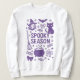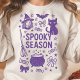 Den här vita tröjan är perfekt för att fira läsksäsongen. Dodle-stil har handritade illustrationer av coquette bows, candy, en häxa, katt, fladdermus, kauldron med mera, allt som omger den festiva frasen "Spooky Season". Det är ett underbart sätt att fira Halloween den här säsongen.
