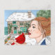 Hand plockade art, det första snö. En dam som håller en kardinal på en snövinter-dag framför en engelsk stuga.