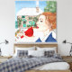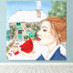 Hand plockade art, det första snö. En dam som håller en kardinal på en snövinter-dag framför en engelsk stuga.