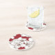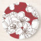 En förskönad linje teckning av vita äppelblommar mot mörkens röda bakgrund.