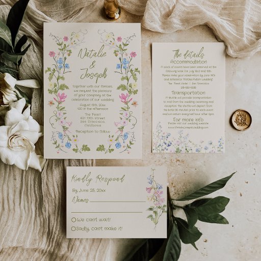 This wedding invitation is perfect for your wedding, if you are looking for an elegant unique and easy editable scannable invitation. An elegant unique floral pink and white and blue and green and yellow wedding template invitation. Which features plain cream background. And whimsical green hand written bride's and groom's first names. With hand drawn quirky illustrated spring wildflowers wreath. And editable info with WE ARE GETTING MARRIED saying on the back and customizable QR Code. Affordable and it is also digital electronic e-invitation if you want to send it by text or email. All the info are customizable by clicking on the personalize button. So Grab it and make it yours so you make you invites engaged and excited .