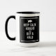 Modern mugg med en vit handlares citat och namn med svart bakgrund. Anpassa till namn.