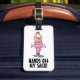 Bagagetaggen är bara sak för en bra som skrattar och som skiljer sitt bagage från de andra vid säckkravet. Det har en lustig tecknad som illustrerar en tjock i en rosa tutu och lyder "HÄNDER OFF MY SACK!" på framsidan. På baksidan finns en mall som du kan använda för att lägga till dina personuppgifter (namn, adress, mobilt, e-post) eller för att ta bort allt detta för en vanlig återgång.