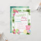 Dessa inbjudningar har handflatan löv med tropiska blommor, en rosa flamingo, en elefant från baby och vattenmelon i blå bakgrund. Den här inbjudan är lätt att anpassa för evenemanget genom att helt enkelt lägga till information.