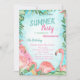 Dessa inbjudningar har handflatan löv med rosa flamingos och glass på blå bakgrund. Den här inbjudan är lätt att anpassa för evenemanget genom att helt enkelt lägga till information.