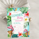 Dessa inbjudningar har handflatan löv med tropiska blommor och glass på blå bakgrund. Den här inbjudan är lätt att anpassa för evenemanget genom att helt enkelt lägga till information.