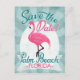 Handflatan Beach Florida Save Date har en rosa flamingo på en roligt turkos-bakgrund.