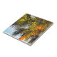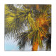 På ett tropiskt humör visar MaeFlowers originalfotografi på detta lilla keramiska Tile överst på handflatan träd med grenar och skräp som badas i varma glöden från eftermiddagen sol. Det långa, spetsade grenar i bakgrunden är mörk grönt och sprider sig som fläkt. Grenar i förgrunden är en lätt gult grönt som krymper utåt när de fångar solljus. Träd, vanligtvis ett medelbrunt färg, ser nästan orange ut i det sena eftermiddagsljus. En blek akvatisk bakgrund i blå himmel avfyrar rikens jordtoner i handflatan träd och fullbordar den tropiska scenen.