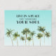 Om du planerar att flytta till Florida, här finns ett vykort för flytta som kommer att uppmärksammas av familj och vänner. Ett motiverande ordspråk i stor text sätts på en akvabrombbakgrund med en gräns av vattenfärgen handflatan träd över kortets grund. Motiveringsgrafiken på nya adress kort lyder: "Lev i ett ställe som omger din själ." All text på baksidan av kortet kan lätt vara personlig med din nya kontaktinformation. Talesmannen är © Barbara Casey.