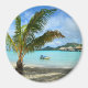 Rund fotomagnet från souvenir från handflatan träd på sandstranden av en lyxövervattnad som skötte tak smekmånsorten på den tropiska ön Bora Bora, nära Tahiti i den pacifistiska Fransken Polynesia.