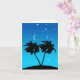 Kort i en svart silhuett i handflatan träd på en tropisk ö, mot en kvällsblå övertoningsbakgrund med stjärnor och halvmånsfärande måne
