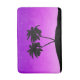 Badmattan i ett silhuett av handflatan träd på en tropisk ö, mot en violett till djup lila skymd övertoningsbakgrund med stjärnor
