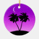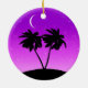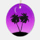 Ornament i en svart silhuett i handflatan träd på en tropisk ö, mot en violett till djup lila skymd övertoningsbakgrund med stjärnor och ett halvljus måne