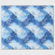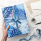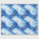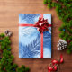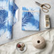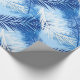 Slå in papper i ett tryck av överlappande handflatanlövsilhouettes, skuggar in av koboltblått, marin/indigoblått och vit, mot en ljus himmelblåttbakgrund