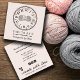 Cute illustrerade stickgarn och verktyg, med rosa hjärta, handgjord med kärlek och ditt namn eller företag namn. Earthy boho vibe , grå och lätt persikofärgad rosa hues.